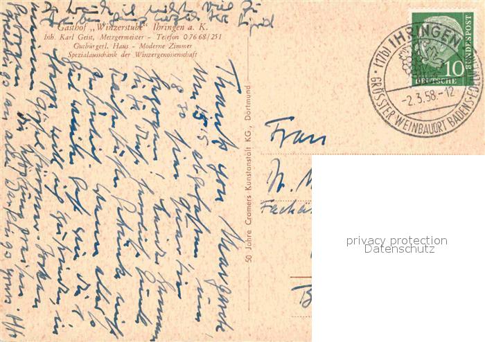 72825103 alte Postkarte Ihringen Gasthof Winzerstube postalisch gelaufen Erhaltung siehe scans [LiesaD40] KatCode: 11110008315059