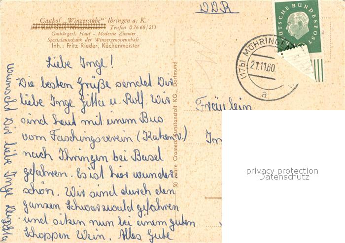 73641077 alte Postkarte Ihringen Gasthof Winzerstube postalisch gelaufen Erhaltung siehe scans [WerneD78] KatCode: 11110008315059