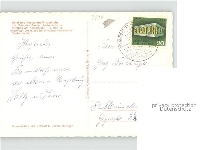 71850701 alte Postkarte Ihringen Hotel Restaurant Winzerstube Weinort Kaiserstuhl Wappen postalisch gelaufen KatCode: 11110008315059