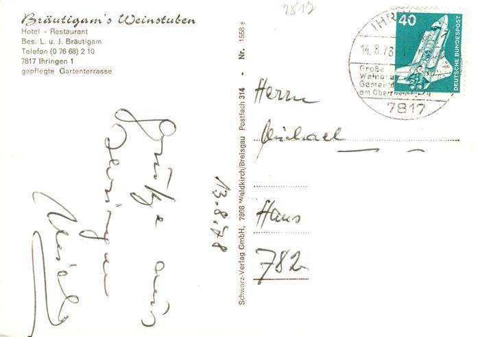 73929064 Ihringen Kaiserstuhl Braeutigams Weinstuben Hotel Restaurant postalisch gelaufen Erhaltung siehe scans [WerneD78] alte Postkarte Wern Katcode 11110008315059