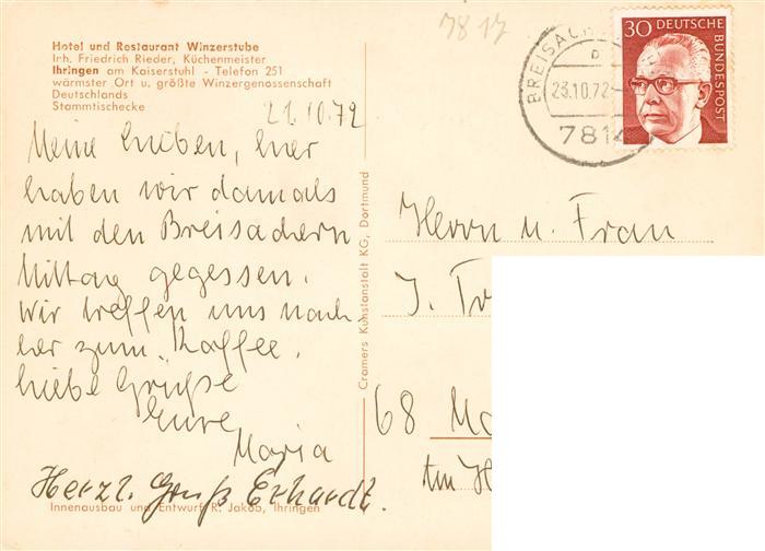 73929103 Ihringen Kaiserstuhl Hotel Restaurant Winzerstube postalisch gelaufen Erhaltung siehe scans [WerneD78] alte Postkarte Wern Katcode 11110008315059