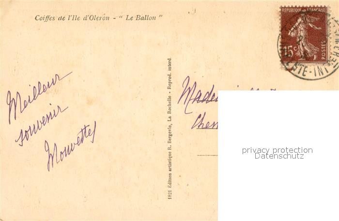 13605706 carte postale Ile d Oleron Coiffes de l’Ile d’Oleron Le Ballon postalisch gelaufen Erhaltung siehe scans [WerneD78] KatCode: 11170017217385