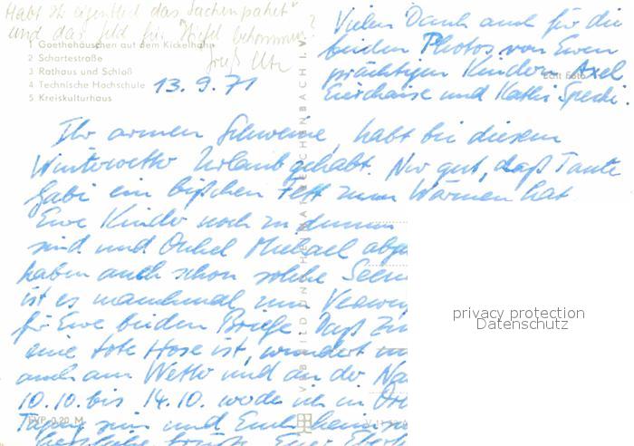 72643722 alte Postkarte Ilmenau Thueringen Goethehaeuschen Scharterstrasse Rathaus Schloss Technische Hochschule Kreiskulturhaus postalisch gelaufen Erhaltung siehe scans [AndreD76] KatCode: 11110016070029