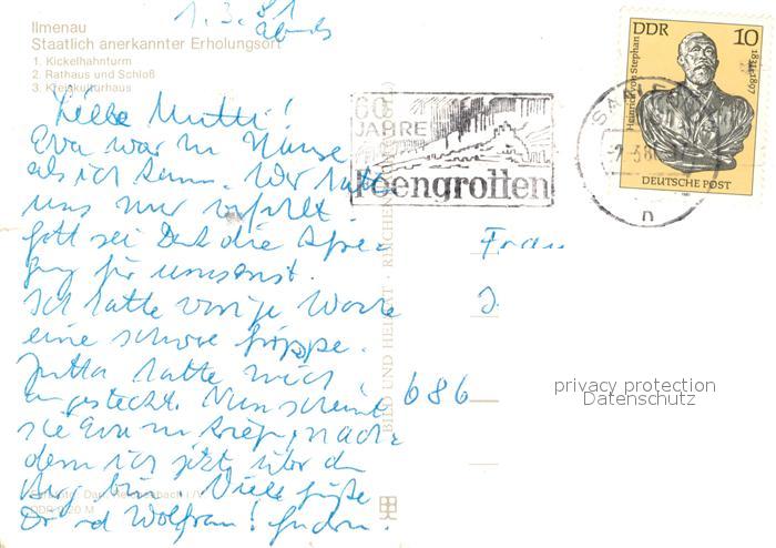 73649912 alte Postkarte Ilmenau Thueringen Kickelhahnturm Rathaus Schloss Kulturhaus postalisch gelaufen Erhaltung siehe scans [FriedD77] KatCode: 11110016070029