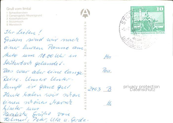 72311368 alte Postkarte Ilmtal Schwalbenstein Camping Meyersgrund Kickelhahnturm postalisch gelaufen Erhaltung siehe scans KatCode: 11110016070056
