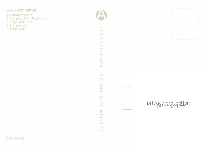 72919551 Ilmtal Schwalbenstein Campingplatz Meyersgrund Kickelhahnturm Stuetzerbach Manebach postalisch nicht gelaufen Erhaltung siehe scans [FriedD77] KatCode: 11110016070056