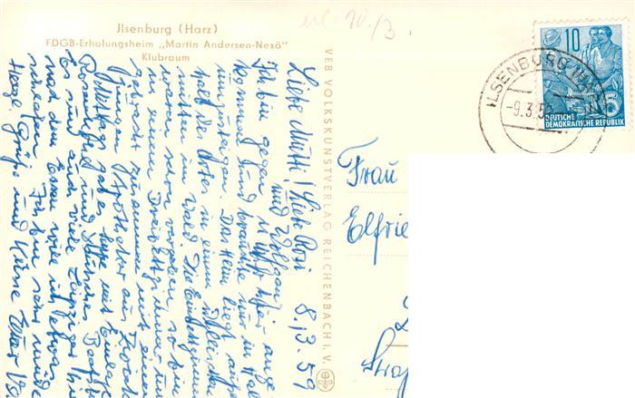 73898396 alte Postkarte Ilsenburg Harz FDGB-Erholungsheim Martin Andersen Nexoe Klubraum postalisch gelaufen Erhaltung siehe scans [FriedD77] KatCode: 11110015085190