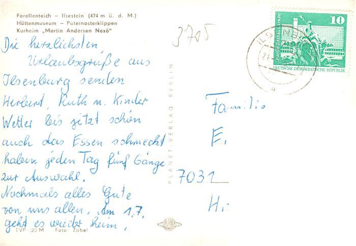 73879398 alte Postkarte Ilsenburg Harz Forellenteich Ilsestein Huettenmuseum Paternosterklippen Kurheim Martin Andersen Nezoe postalisch gelaufen Erhaltung siehe scans [FriedD77] KatCode: 11110015085190