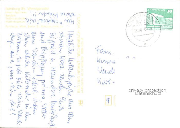72324148 alte Postkarte Ilsenburg Harz Hirsch Apotheke Ilsestein Thaelmannstr Huettenmuseum postalisch gelaufen Erhaltung siehe scans KatCode: 11110015085190