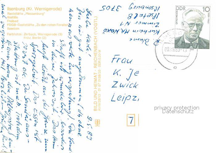 72698317 alte Postkarte Ilsenburg Harz Raststaette Plessenburg Ilsefaelle Freibad FDGB Gaststaette Zu den roten Forellen Ilsenstein postalisch gelaufen Erhaltung siehe scans [WerneD78] KatCode: 11110015085190