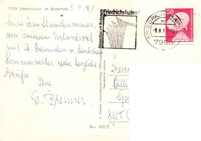 73941489 alte Postkarte Immenstaad Bodensee Fliegeraufnahme Fachwerkhaus Promenade Park Strassenpartie Tennisplatz Bootshafen Spielplatz postalisch gelaufen Erhaltung siehe scans [WerneD78] KatCode: 11110008435024