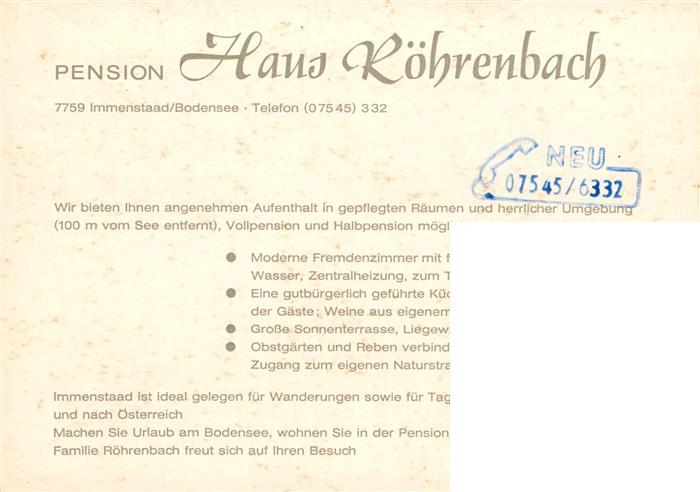 73942092 Immenstaad Bodensee Pension Haus Roehrenbach postalisch nicht gelaufen Werbekarte (keine Postkarte) Erhaltung siehe scans [WerneD78] KatCode: 11110008435024