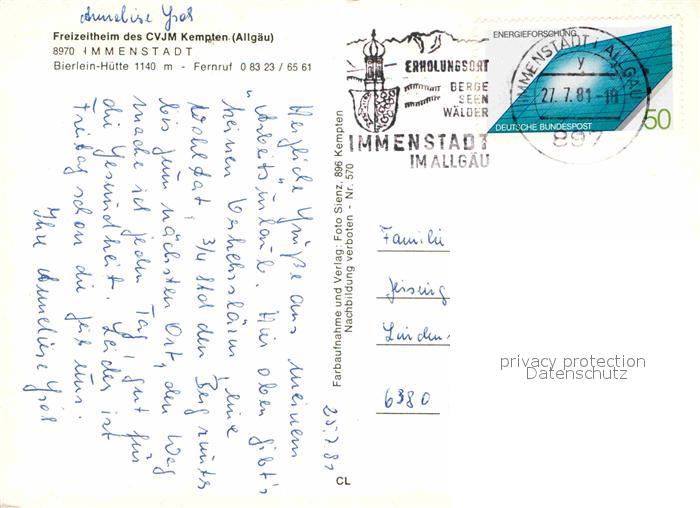 72667062 alte Postkarte Immenstadt Allgaeu Freizeitheim des CVJM Kempten postalisch gelaufen Erhaltung siehe scans [LiesaD40] KatCode: 11110009780124