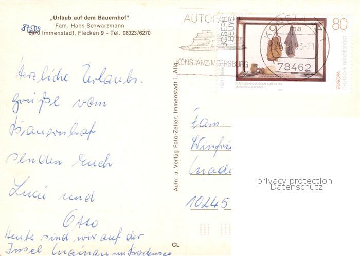 73792757 alte Postkarte Immenstadt Allgaeu Urlaub auf dem Bauernhof Alpsee Gruentendenkmal Burg Laubenberg Stadtpanorama Allgaeuer Alpen postalisch gelaufen Erhaltung siehe scans [FriedD77] KatCode: 11110009780124