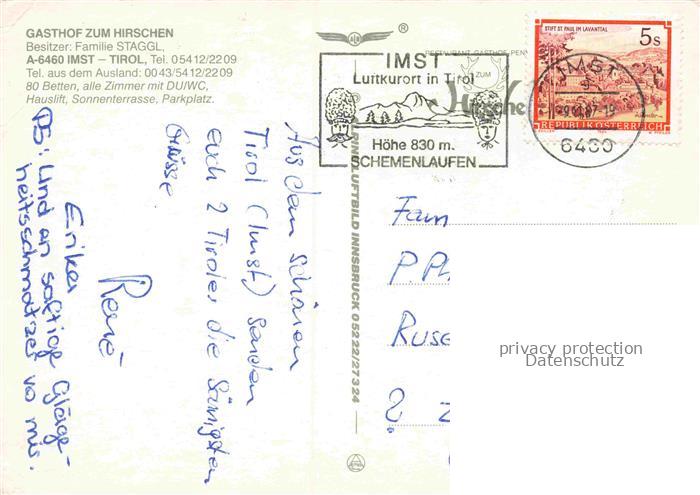 74157584 alte Postkarte Imst Tirol AT Kirchturm Statue Strassenszene Bergpanorama Luftkurort Schemenlaufen Gasthof-Hirschen postalisch gelaufen Erhaltung siehe scans [Karloger] KatCode: 11390334070203