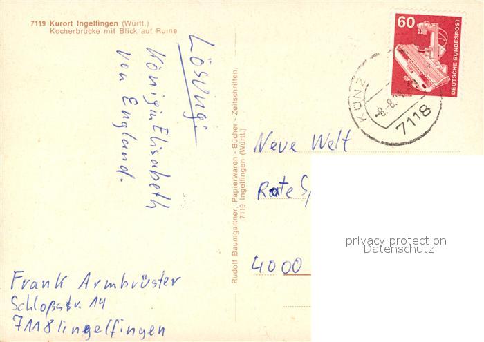 73119080 alte Postkarte Ingelfingen Bad Kocherbruecke Ruine postalisch gelaufen Erhaltung siehe scans [KathaD81] KatCode: 11110008126039