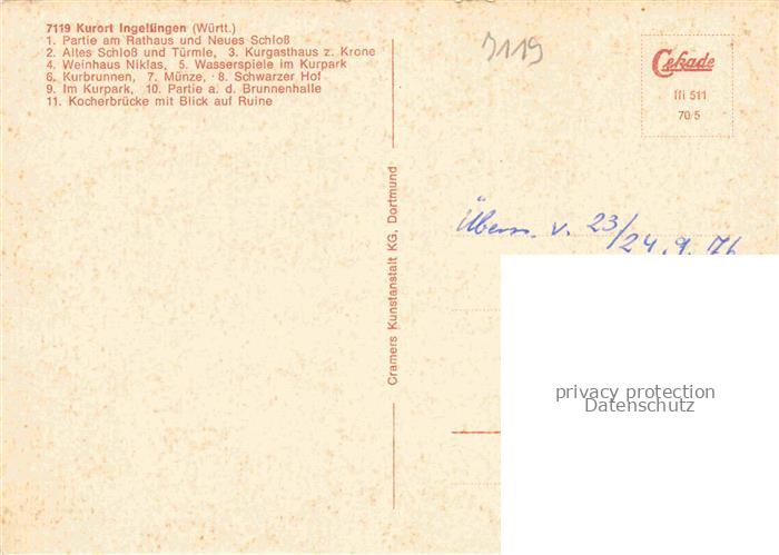 74054826 Ingelfingen Rathaus Schloss Tuermle Kurgasthaus Weinhaus Wasserspiele Kurpark Brunnen Muenze Schwarzer Hof Brunnenhalle Kocherbruecke Burgruine postalisch nicht gelaufen Erhaltung siehe scans [FriedD77] KatCode: 11110008126039