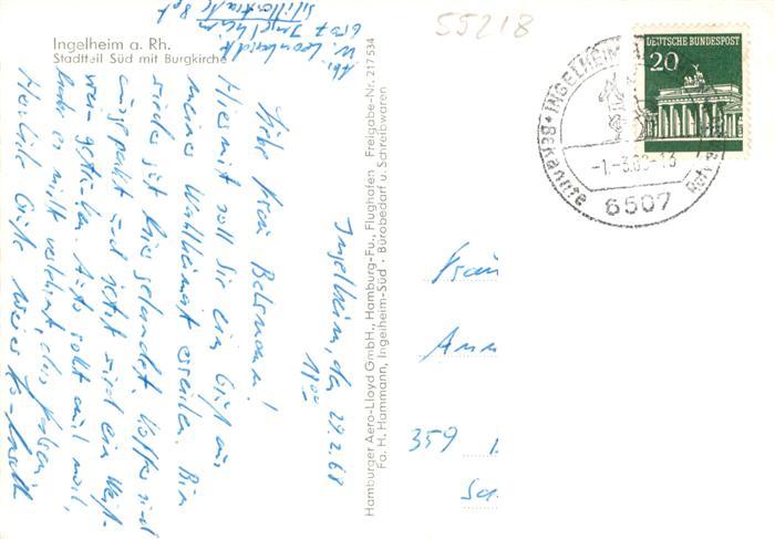 73873277 alte Postkarte Ingelheim Rhein Stadtteil Sued mit Burgkirche postalisch gelaufen Fliegeraufnahme Erhaltung siehe scans [FriedD77] KatCode: 11110007339030