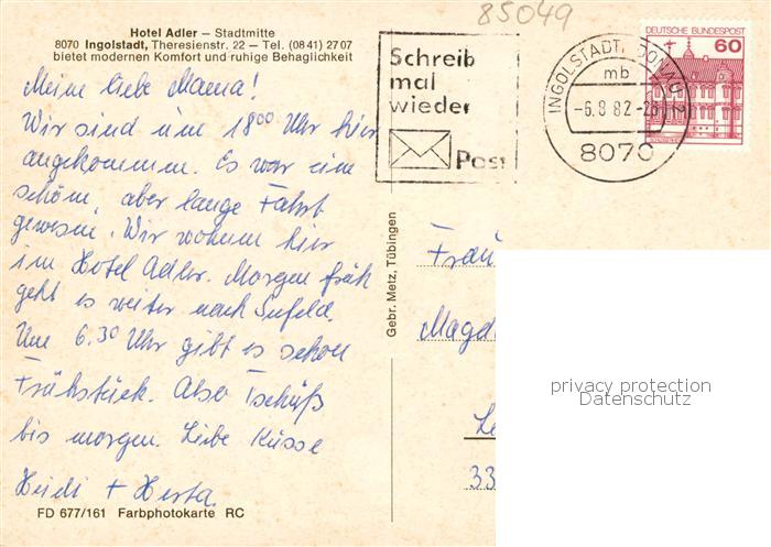 73867108 INGOLSTADT CITY Hotel Restaurant Adler postalisch gelaufen Erhaltung siehe scans [FriedD77] alte Postkarte Frie Katcode 11110009161000