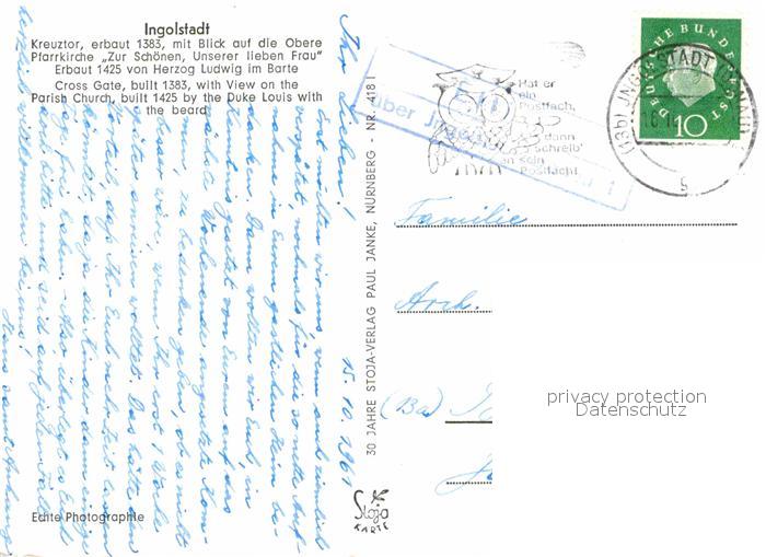 72821382 alte Postkarte INGOLSTADT CITY Kreuztor 14. Jhdt. Pfarrkirche postalisch gelaufen Erhaltung siehe scans [FriedD77] KatCode: 11110009161000