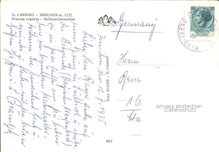 old postcard Innichen Suedtirol Ortsansicht mit Kirche Alpen Hallenschwimmbad postalisch gelaufen Erhaltung siehe scans