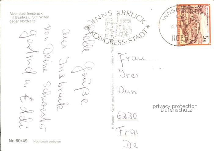 72430253 alte Postkarte Innsbruck Alpenstadt Basilika Stift Wilten Nordkette postalisch gelaufen Erhaltung siehe scans KatCode: 11390332070101