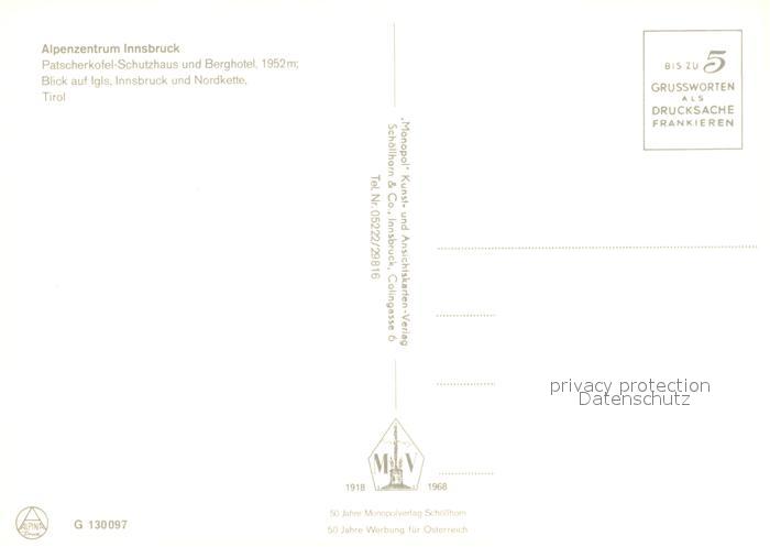 73245815 Innsbruck Alpenzentrum Patscherkofel Schutzhaus Berghotel Blick auf Igls Innsbruck und Nordkette postalisch nicht gelaufen Erhaltung siehe scans [FriedD77] KatCode: 11390332070101