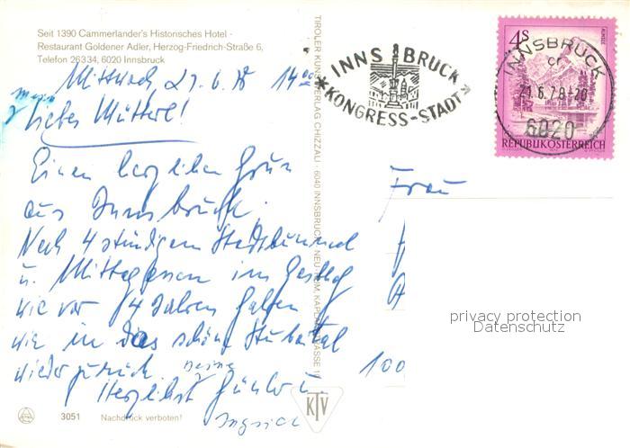 73641479 alte Postkarte Innsbruck Cammerlander’s Historisches Hotel Restaurant Goldener Adler postalisch gelaufen Erhaltung siehe scans [FriedD77] KatCode: 11390332070101