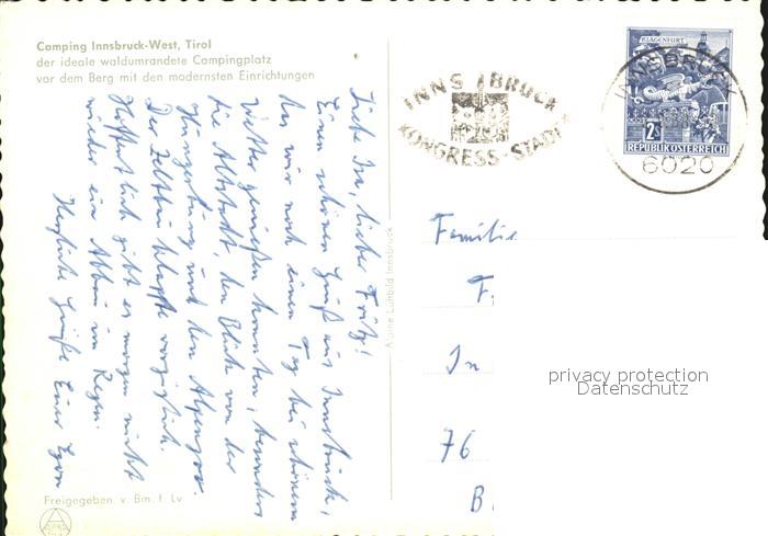 72494082 alte Postkarte Innsbruck Camping Innsbruck-West postalisch gelaufen Erhaltung siehe scans KatCode: 11390332070101