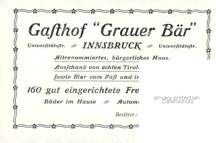 32664787 Innsbruck Gasthof Grauer Baer Universitaetsstrasse postalisch nicht gelaufen Werbekarte (keine Postkarte) Erhaltung siehe scans [LiesaD40] KatCode: 11390332070101