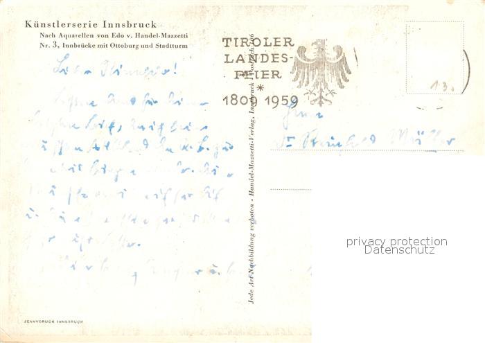 43243289 alte Postkarte Innsbruck Innbruecke mit Ottoburg und Stadtturm Aquarell postalisch gelaufen Erhaltung siehe scans [WerneD78] KatCode: 11390332070101