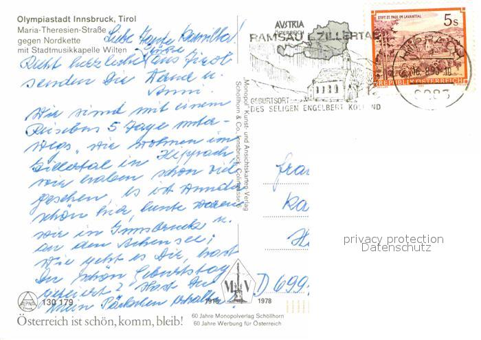 72898292 alte Postkarte Innsbruck Maria Theresia Strasse Stadtmusikkapelle Wilten postalisch gelaufen Erhaltung siehe scans [AndreD76] KatCode: 11390332070101