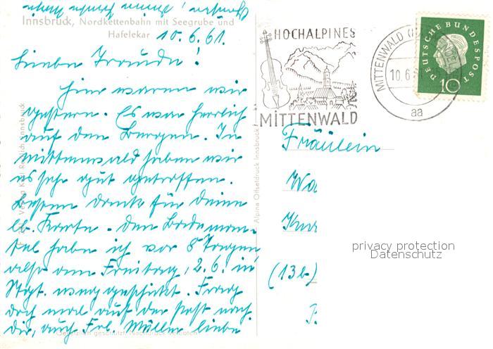 73516641 alte Postkarte Innsbruck Nordkettenbahn mit Seegrube und Hafelekar postalisch gelaufen Erhaltung siehe scans [FriedD77] KatCode: 11390332070101
