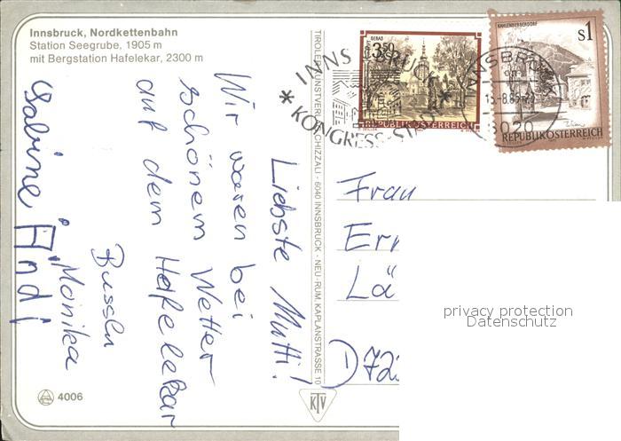 72479284 alte Postkarte Innsbruck Nordkettenbahn Station Seegrube postalisch gelaufen Erhaltung siehe scans KatCode: 11390332070101
