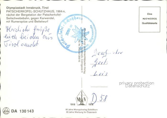 72438221 alte Postkarte Innsbruck Patscherkofel Schutzhaus postalisch gelaufen Erhaltung siehe scans KatCode: 11390332070101