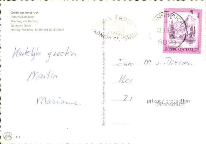 72416517 alte Postkarte Innsbruck Patscherkofelbahn Rennweg Hofburg Goldenes Dachl Herzog Friedrich Strasse postalisch gelaufen Erhaltung siehe scans KatCode: 11390332070101