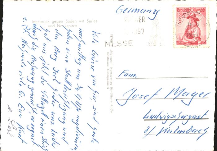 71432861 alte Postkarte Innsbruck Sueden Serles Nockspitze postalisch gelaufen Erhaltung siehe scans KatCode: 11390332070101