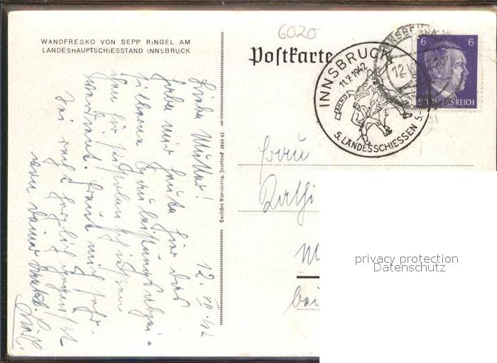 31740063 alte Postkarte Innsbruck Wandfresko von Sepp Ringel am Landeshauptschliesstand postalisch gelaufen Erhaltung siehe scans KatCode: 11390332070101