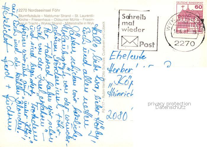 73159583 alte Postkarte Insel Foehr Sturmflutsaeule Strand Friesinnen in Tracht Friesenhaus Kirche Windmuehle Wappen postalisch gelaufen Erhaltung siehe scans [FriedD77] KatCode: 11110001054164