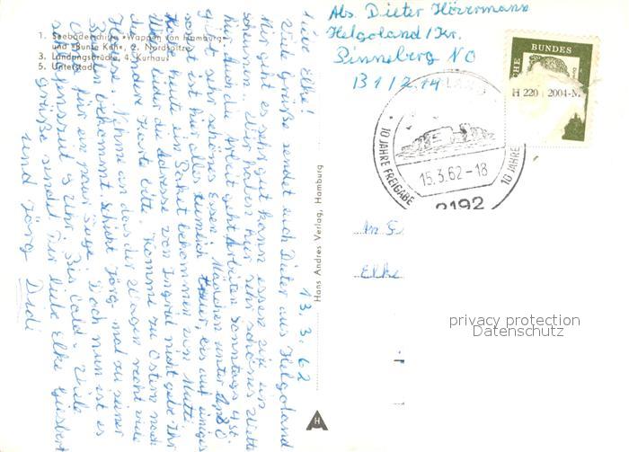 73164189 alte Postkarte Insel Helgoland Seebaederschiffe Nordspitze Lange Anna Landungsbruecke Kurhaus Unterstadt Rettungsring Moewe Krabbe postalisch gelaufen Erhaltung siehe scans [FriedD77] KatCode: 11110001056025