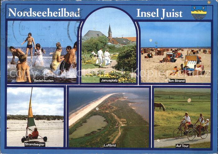 72525289 alte Postkarte Insel Juist Badespass Janusplatz Strand Strandsegler Fliegeraufnahme Auf Tour postalisch gelaufen Erhaltung siehe scans KatCode: 11110003452020