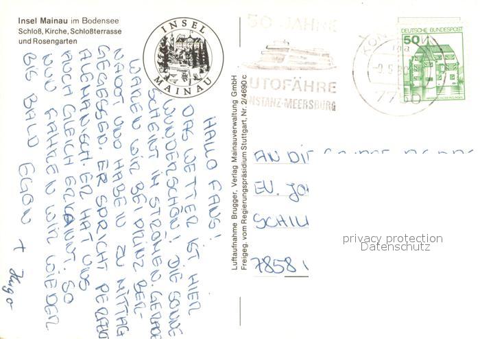 73622543 alte Postkarte Insel Mainau Fliegeraufnahme mit Schloss Kirche Schlossterrasse und Rosengarten postalisch gelaufen Erhaltung siehe scans [WerneD78] KatCode: 11110008335043