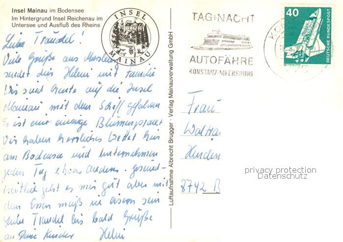 73084404 alte Postkarte Insel Mainau im Hintergrund Insel Reichenau im Untersee Rheinausfluss Fliegeraufnahme postalisch gelaufen Erhaltung siehe scans [FriedD77] KatCode: 11110008335043