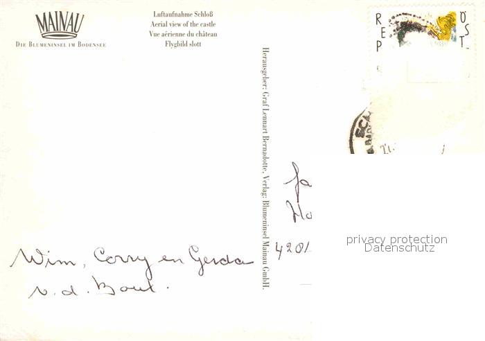 72909120 alte Postkarte Insel Mainau Lennart Bernadotte Schloss Fliegeraufnahme postalisch gelaufen Erhaltung siehe scans [FriedD77] KatCode: 11110008335043