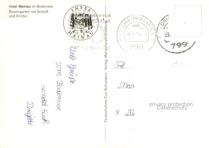 72739830 alte Postkarte Insel Mainau Rosengarten mit Schloss und Kirche postalisch gelaufen Erhaltung siehe scans [LiesaD40] KatCode: 11110008335043