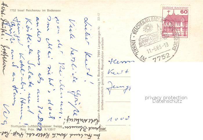 73597253 alte Postkarte Insel Reichenau Marien Muenster Fliegeraufnahme St Georgskirche postalisch gelaufen Erhaltung siehe scans [WerneD78] KatCode: 11110008335066