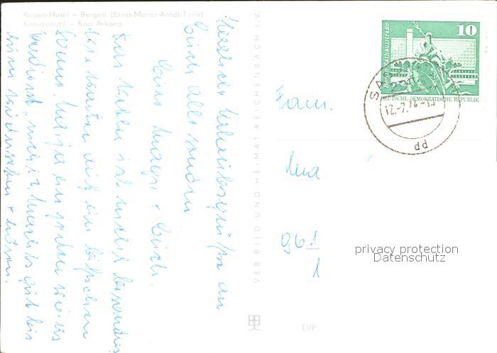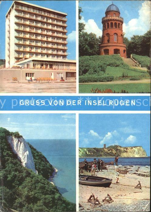 72263230 alte Postkarte Insel Ruegen Ruegen Hotel Bergen Ernst Moritz Arndt Turm Koenigsstuhl Kreidefelsen Kap Arkona postalisch gelaufen Erhaltung siehe scans KatCode: 11110013061004