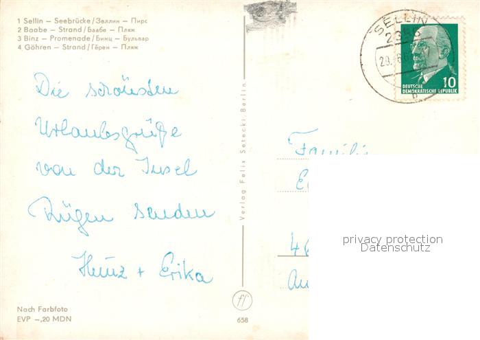73158717 alte Postkarte Insel Ruegen Sellin Seebruecke Baabe Strand Binz Promenade Goehren Strand postalisch gelaufen Erhaltung siehe scans [FriedD77] KatCode: 11110013061004