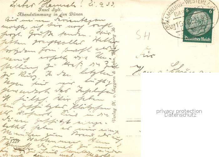 73686334 alte Postkarte Insel Sylt Abendstimmung in den Duenen postalisch gelaufen Bahnpost Erhaltung siehe scans [FriedD77] KatCode: 11110001054151