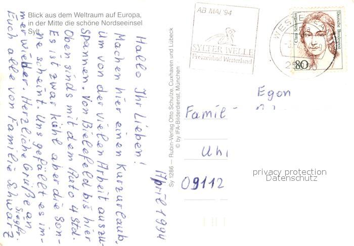 73158779 alte Postkarte Insel Sylt Blick aus dem Weltraum auf Europa Erdkugel postalisch gelaufen Erhaltung siehe scans [FriedD77] KatCode: 11110001054151